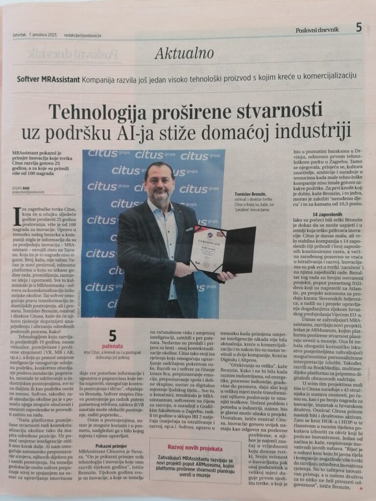 In today’s issue of Poslovni dnevnik, the article Augmented Reality Technology with AI Supports is Coming to Domestic Industry.
